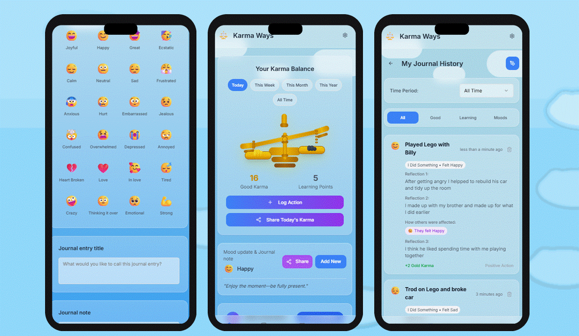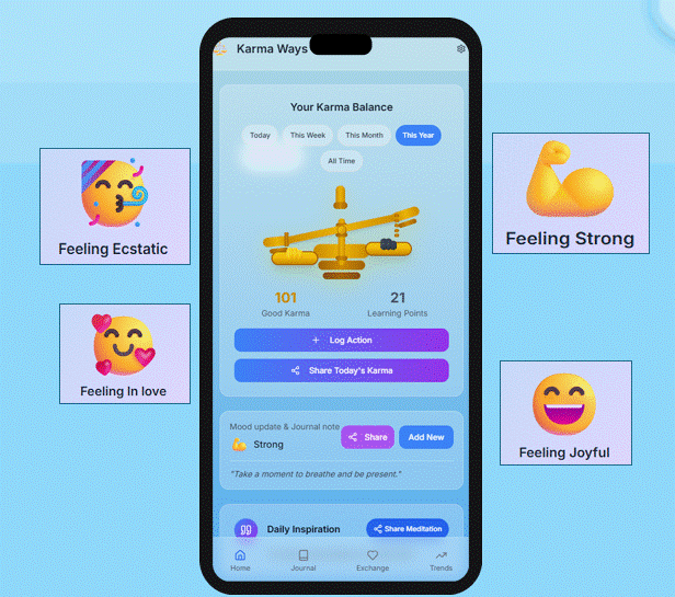 Karma & Learning Points: Every entry contributes to your balance, with points awarded based on your emotional responses and interactions with others.